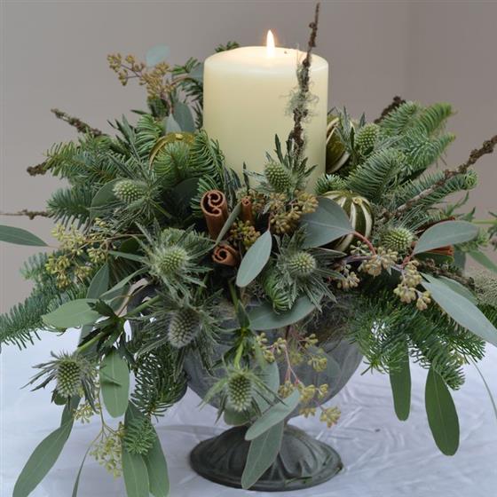 Our bestselling white candle arrangement with fresh softly scented nobilis pine, cinnamon sticks and adornments. ( Pot may vary from the image)standard size 16cm pot large 20cm