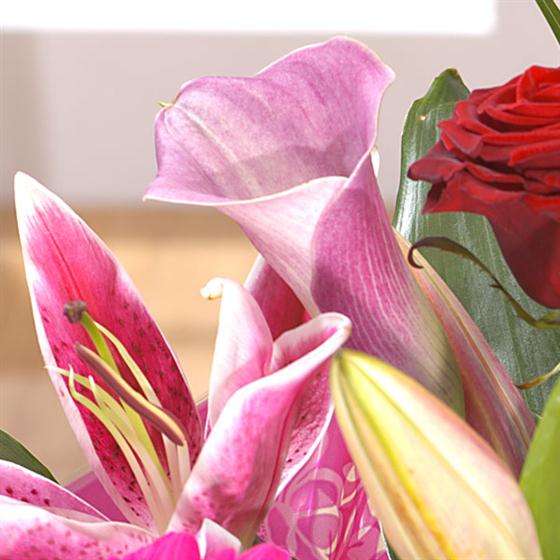 A seductive collection of flowers starring deep velvet Roses, carnations and fragrant Lilies. This is bound to capture anyone's heart.