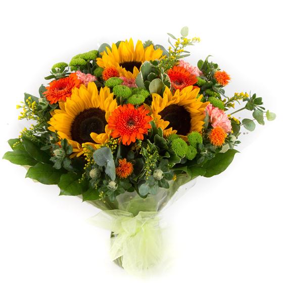 Sunflowers are the focal point of this dazzling, citrus hand-tied bouquet. To avoid disappointment please contact os to confirm sunflower availability.