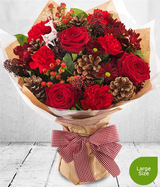 We've got Christmas all wrapped up with this pretty Aqua-pack Bouquet. A single white deer is nestled in amongst an array of rich red Roses, Chrysanthemums, Carnations, pine cones and berries.