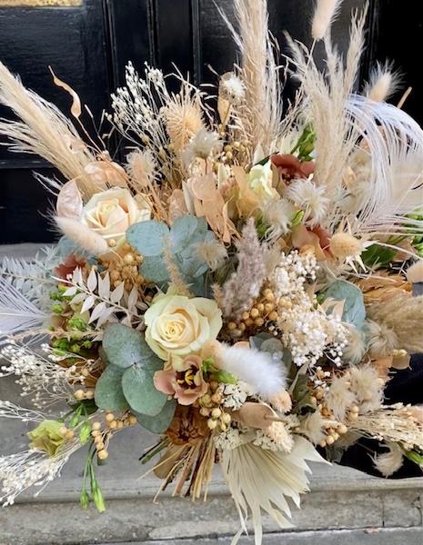 A truly stunning bouquet comprising of fresh cream avalanche roses and a variety of creams and Taupe coloured pampas and dried stems, a real showstopper. Once the roses have passed their best you can add fresh ones to the remaining dried bouquet for a everlasting bouquet!