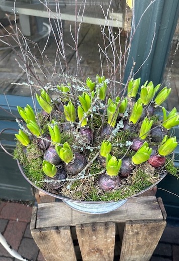 A beautiful, natural Hyacinth bulb arrangement, a cheerful spring favourite and best seller. Pot may vary from image shown.
