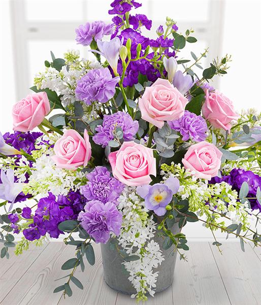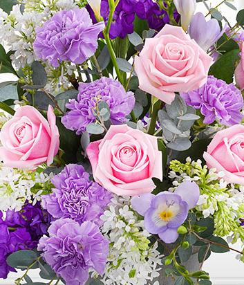 An enchanting flower display exquisitely presented, featuring pink Roses, white Lisianthus, purple Stocks with lilac Carnations and delicately fragrant Freesias. Flowers may vary depending on availability. This bouquet will be presented in a water pack.
