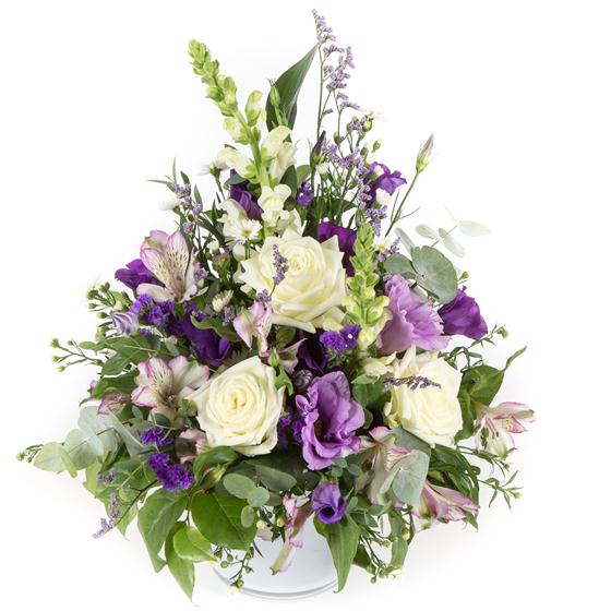 A sweet arrangement in shades of whites, creams, lilacs and purples including roses, september flower, lisianthus and alstromeria.