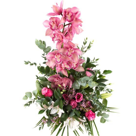 A spectacular cymbidium orchid arrangement with scented lilies, roses and delicate foliage.