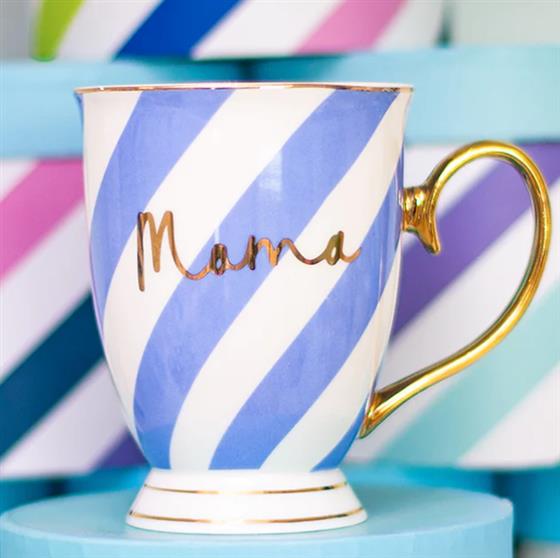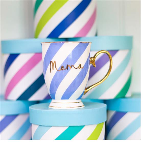 A companion to the Hello Gorgeous mug or to go solo... This mug has it all: a stylishly elongated oval shape, crisp diagonal stripes in a zingy sherbert colour, gold detailing along the top and bottom and a gold handle and as the icing on the cake, Mama in gold flowing cursive.