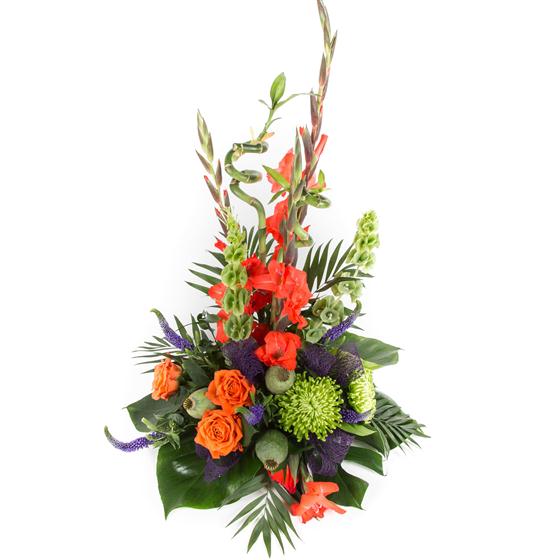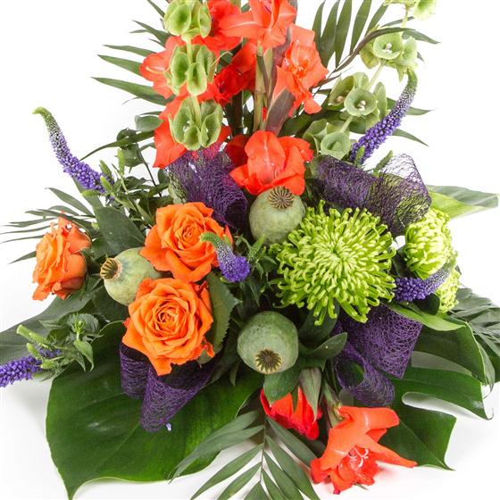 An imposing display of magnificent, contemporary blooms in tropical shades of purple, orange and lime.