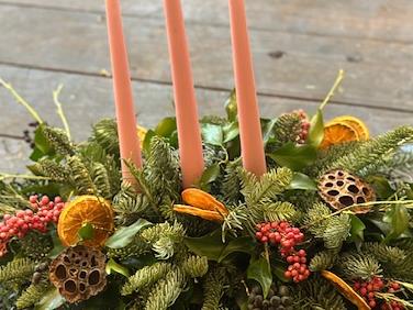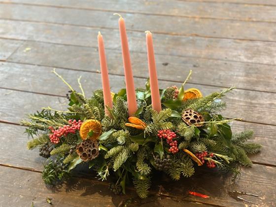 A stunning table centrepiece with a trio of candles and natural foliage. Approx 50cm long. Please let us know if you would like cream or red candles instead of pink as shown in the notes section
