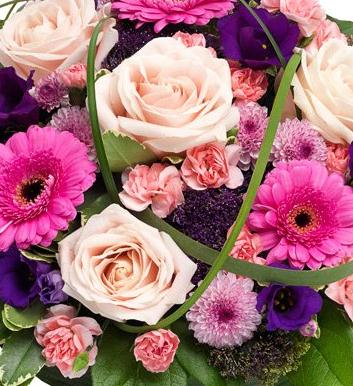 A pretty pink and purple posy pad featuring pink Roses and Carnations, cerise Germini, purple Lisianthus and Trachelium with lavender Chrysanthemums.