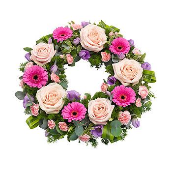 A pretty pink wreath featuring Roses, Germini and Carnations with lilac Lisianthus and mix of luscious green foliage.Standard is 35cm medium 40cm large 45cm