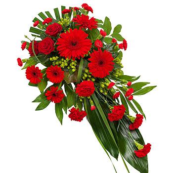 A stunning red single ended spray of Roses, Germini, Gerberas and Carnations all neatly nestled amongst an array of luscious green foliage. Standard size approx 55cm large 65cm