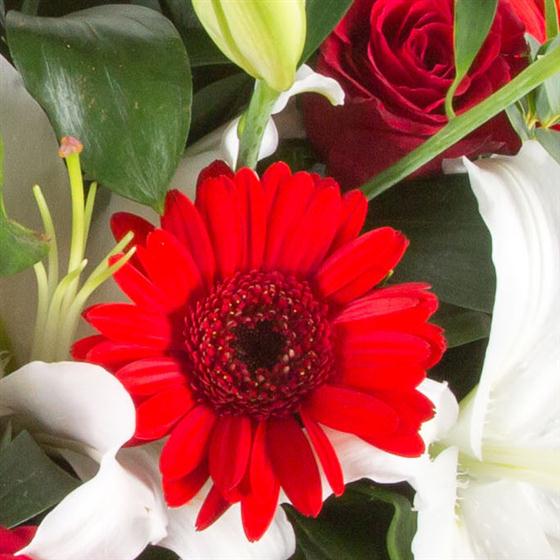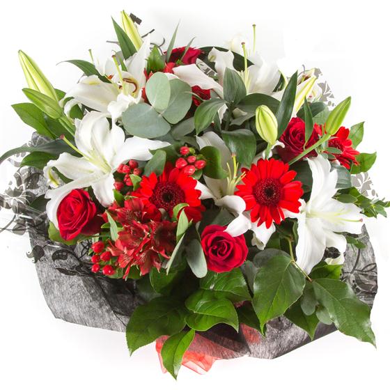 A highly scented hand-tied bouquet of oriental white lilies, berries, roses and scarlet red gerbera.