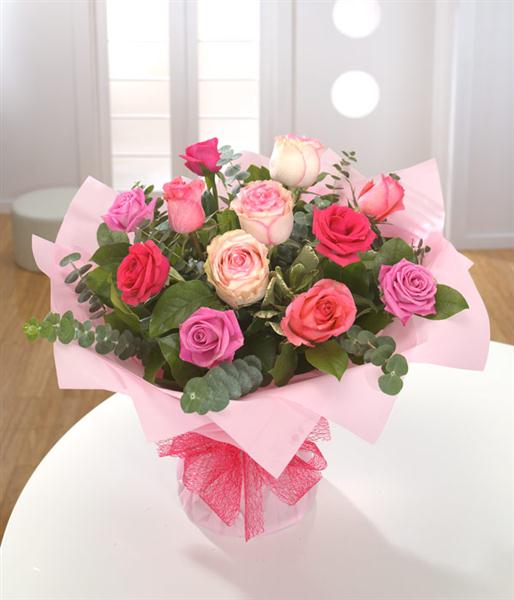 Simple yet beautiful - a mixed palette of pink Roses presented as an aqua pack hand-tied.