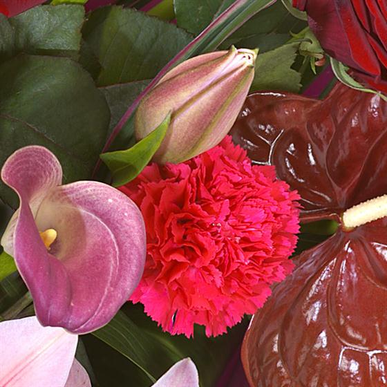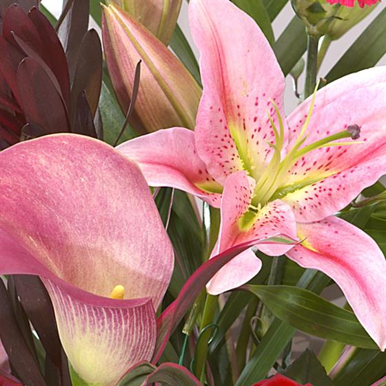 Not just colour but texture too - this aqua pack has velvety Roses, Chrysanthemums, smooth Calla Lilies, Gerbera and frilly Lisianthus. Please note the colours of flowers may vary depending on availability