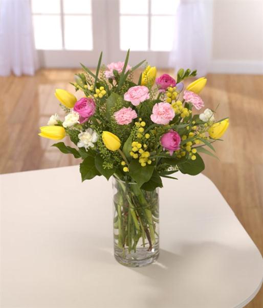 It's a pastel bonanza Spring bouquet! From yellow Tulips to pink Ranunculus and other spring complimentary flowers.Please note flower stem colour and variety may vary depending on availability
