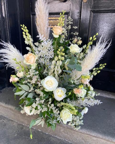A truly stunning pedestal arrangement. This pedestal contains the freshest cream & peach avalanche roses, delphiniums, aconitum, fluffy pampas grass, lisianthus, dried ruscus and other complimentary blooms. NB. This pedestal can be made using any particular favourite colours or flowers please call us directly to discuss the alternatives 01892 731267