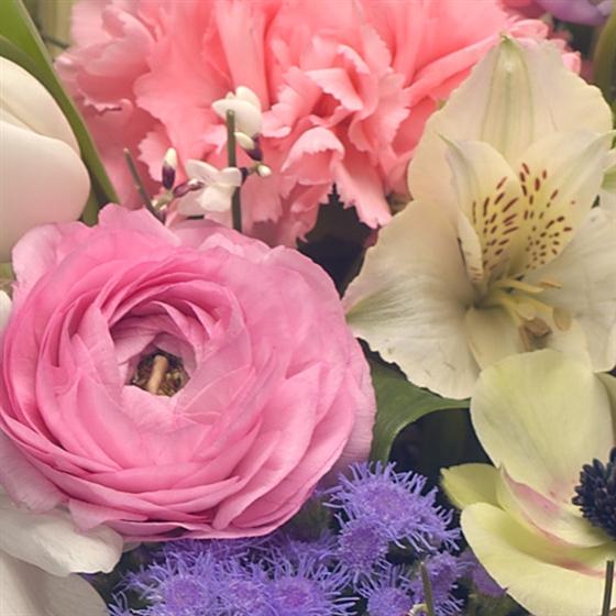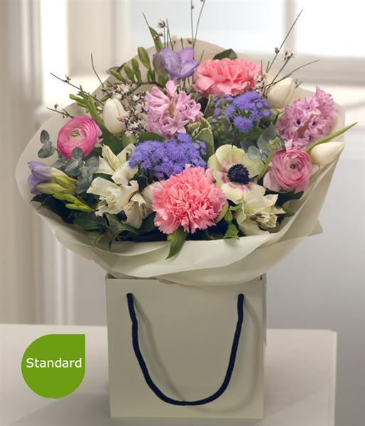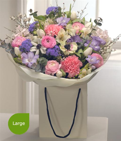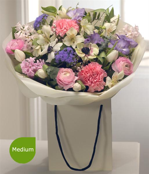 A fantastically fragrant aqua pack gift bag bouquet in delicate springtime pastel shades. Pink Hyacinth, Carnations and Ranunculus are married with white Alstromeria, Ageratum, Anemone and Tulips. Lavender Freesias complete the arrangement.