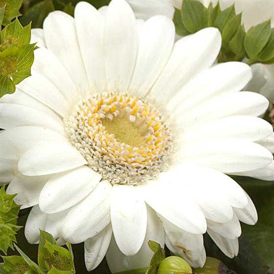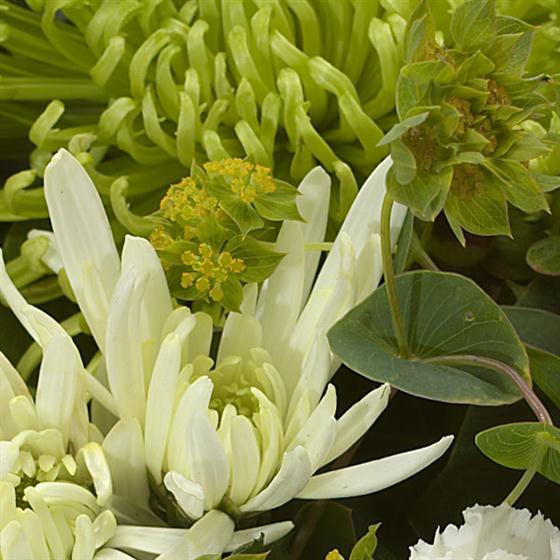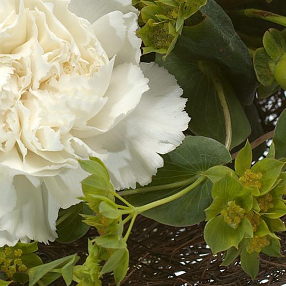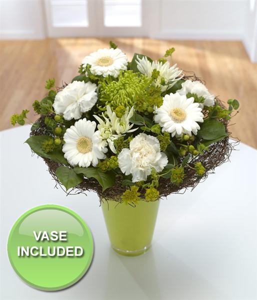 A natural twig collar is integral to this vase arrangement of white Gerbera, Carnations and spider Chrysanthemums with a centre of green Chrysanthemums.