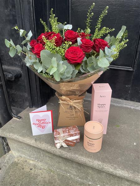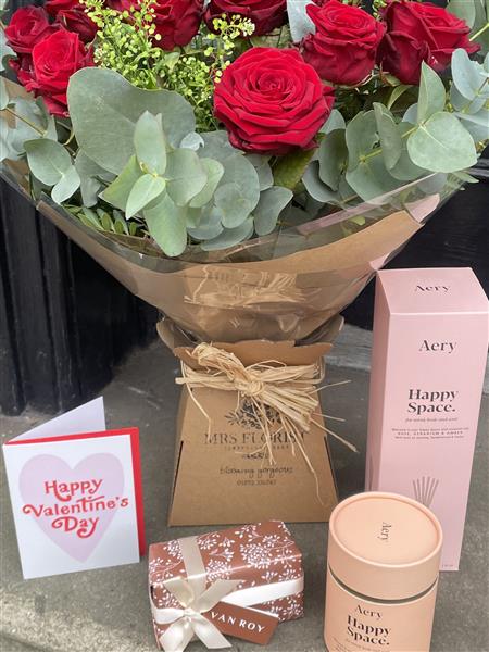 The ultimate gift. A stunning dozen red rose bouquet, a beautifully scented candle by Avery, a lovely scented diffuser by Avery, Luxury Van Roy Chocolates and a hand written full size card.