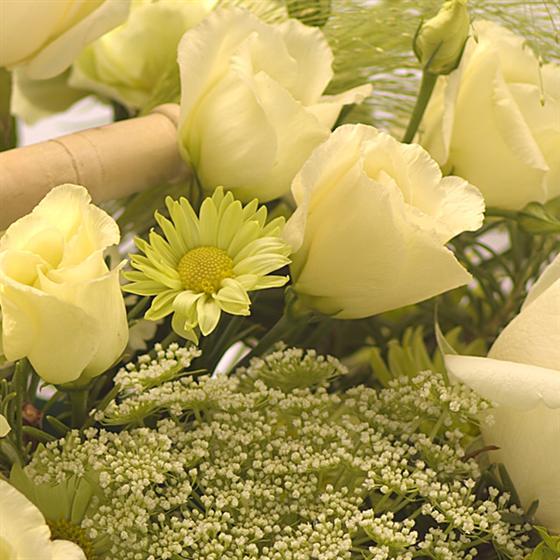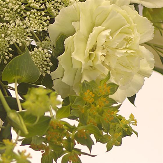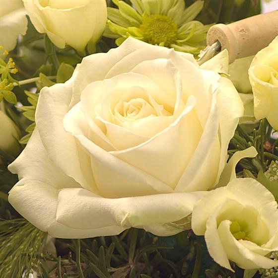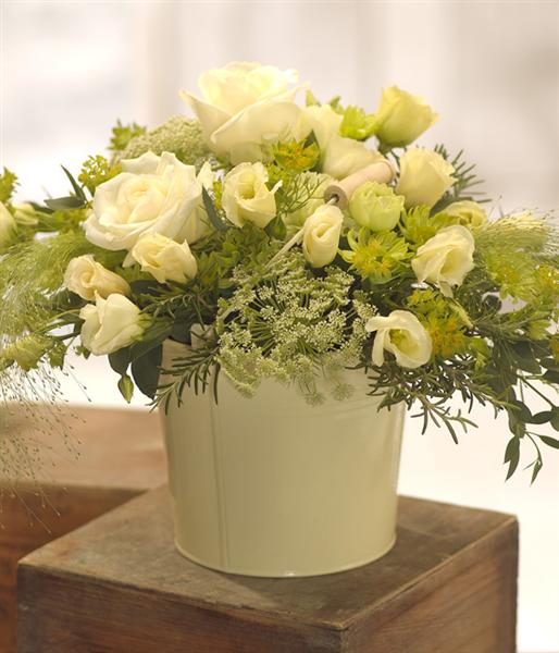 A beautifully cool colour combination of Roses, Lisianthus, Chrysanthemums and foliage, presented in a lovely flower container