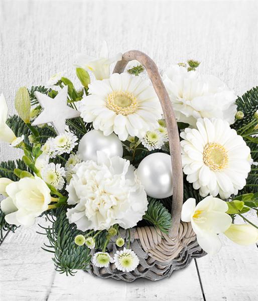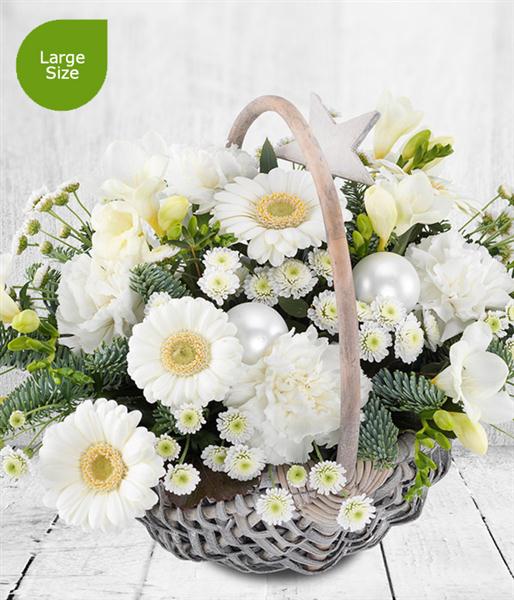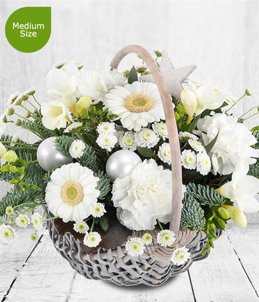 Freesias, Chrysanthemums, Germini and Carnations combine to make this a very pretty white Christmas flower Basket.